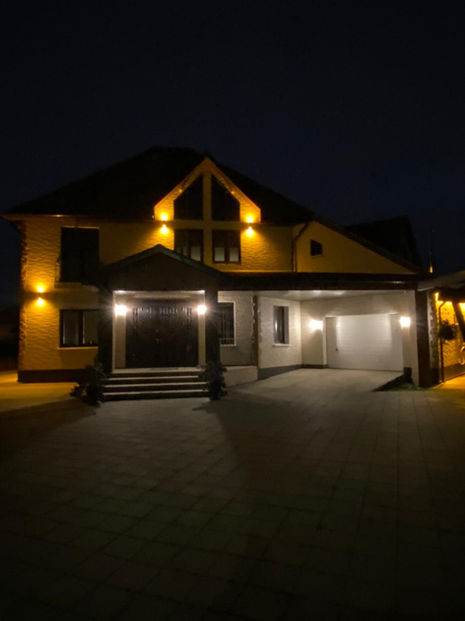 В проекте были применены редкие светильники с "шторками" которые дают тень виде перевернутого усеченного конуса. Композиция из светильников делает ромбовидные тени которые идеально вписались в ночной облик дома.